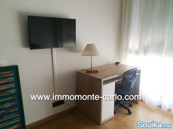Appartement neuf, haut standing et meublé, d'une superficie de 120 m², situé dans une résidence sécurisée. Il comprend un hall d’entrée, salon européen (TV et table basse comprises), une terrasse donnant sur un jardin privatif de 20 m², une salle à manger, une cuisine équipée avec buanderie, ainsi qu'une chambre à coucher en suite parquetée avec dressing et salle de bain (jacuzzi + robinetterie de haut de gamme). Climatisation centralisée. Immeuble avec parking et ascenseur. ,…