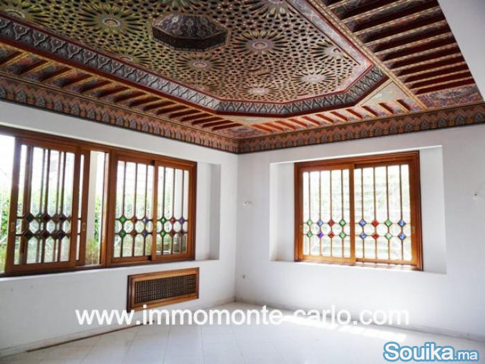 Villa avec piscine à louer Hay Riad à Rabat, chauffage central, villa entourée d’un beau jardin avec piscine et puit, composée de triple salons avec deux coins cheminés, bureau, salle d’eau des invités, séjour, 4chambres, 3salles de bain, dressing, placards, terrasses, balcons, une cuisine aménagée, buanderie, logement de personnel,…
