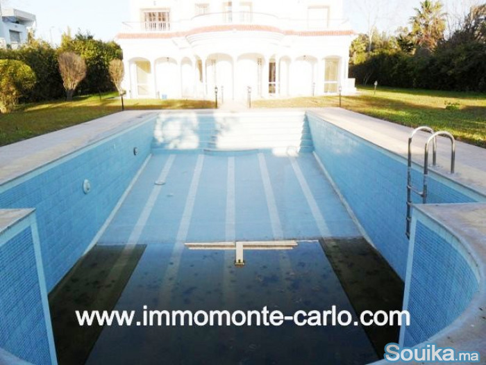 Villa de haute standing à louer Souissi Rabat, avec piscine et climatisation dans toutes les pièces, ensoleillée bien sécurisée et très bien située à Rabat, avec un grand garage et jardin bien entretenue avec puits, construite sur trois niveaux, composée de triple salons, deux cheminées, séjour, salle d’eau des invités, chambre parental avec dressing et salle de bain, 4chambres, 3salles de bain, terrasse, balcons, cuisine, buanderie, et au Sous sol un chambre avec salle de bain, une deuxième cuisine, pièce de rangement…