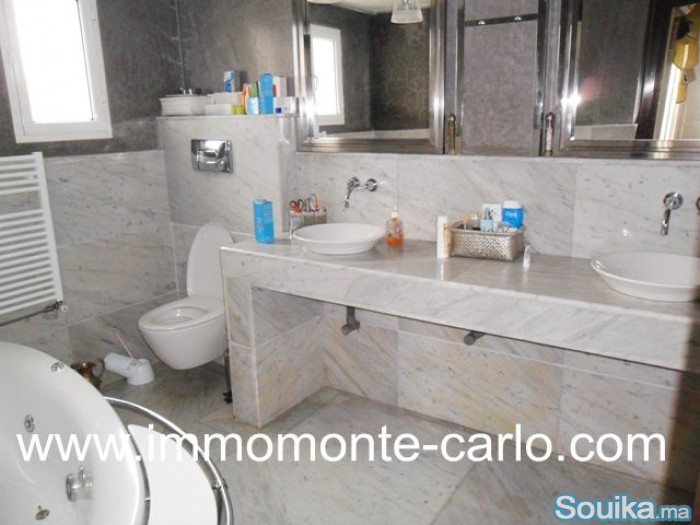À louer villa bien meublée à Rabat Hay Riad.Dans un environnement privilégié, belle villa bénéficiant de prestations luxueuses, avec piscine, chauffage central, climatisation réversibles dans toutes les pièces,Situé sur une rue tranquille en plein cœur d’un quartier branché et résidentiel : grandes surfaces, restos, cafés, boutiques, épiceries, services, agences de voyage, pharmacies, salles de sport, musique et danse, rues piétonnes bordée de terrasses, où l'on apprécie se promener avec les enfants dans la journée ou les soirs d'été. Villa construite sur 3 niveaux avec un beau jardin avec mobilier de terrasse et grand garage, comprenant double salons avec un coin cheminée, une terrasse couverte offrant une superbe vue sur la piscine et le jardin ,un séjour lumineux, une salle à manger, salle d’eau des invités, une suite parentale avec dressing et salle de bain avec jacuzzi, grande terrasse 3chambres à coucher chacune avec sa salle de bain et balcons, une cuisine bien équipée (réfrigérateur, congélateur, plaques vitro, four, ..), internet haute vitesse, ameublement, literie, lave-vaisselle, laveuse-sécheuse…… buanderie, logement de personnel, débarras, à louer pour longue durée,Pour plus d’informations ou visite n’hésitez pas de contacter notre agence immobilière Immo Monte-Carlo au N° de tél: +212661464037/ +212661212547ou Tél/Fax: +212537755043 ou par E-mail : immomontecarlo@gmail.com ou visitez notre site ou rendez-vous à rue DayetAoua, Imm 2, Apt 3, Agdal Rabat.