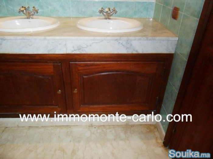 À louer villa meublée à Rabat au quartier Souissi. Dans un environnement privilégié, villa bien meublée avec piscine privée et jardin. Idéalement située dans un quartier résidentiel, bénéficiant de prestations hauts de gamme, beaux volumes aux grandes baies vitrées sans aucun vis à vis et superbe vue sur le jardin, piscine, une grande terrasse couverte et avec mobilier , Les sols intérieurs et extérieurs (terrasses) sont en marbre beige et mosaïque assortie et parquets pour les chambres, finitions et matériaux de luxe . Mobiliers contemporains et de grandes qualités, située sur une rue tranquille en plein cœur d’un quartier branché et résidentiel : grandes surfaces, restos, cafés, boutiques, épiceries, services, pharmacies, salles de sport, musique et danse,... Villa construite sur 2 niveaux, villa lumineuse composée de doubles salons avec un coin cheminée, salle à manger, WC des invités, 5 chambres : Une suite parentale avec salle de bain et dressing, grande terrasse, chambre amis avec dressing et salle de bain 3chambres à coucher chacune avec sa salle de bain et grande placards, balcons, cuisine bien équipée avec une table à manger et ses chaises, grand garage, logement de personnel,… Villa très bien équipée : TV, lecteur DVD, Connexion Internet, Wifi, lave linge, sèche linge, lave vaisselle, four, micro ondes, plaque de cuisson, hotte aspirante, à louer pour longue durée (à partir d’un an). Pour plus d’informations ou visite n’hésitez pas de contacter notre agence immobilière Immo Monte-Carlo au N° de tél: +212661464037/ +212661212547 ou Tél/Fax: +212537755043 ou par E-mail : immomontecarlo@gmail.com ou visitez notre site ou rendez-vous à rue Dayet Aoua, Imm 2, Apt 3, Agdal RABAT MAROC